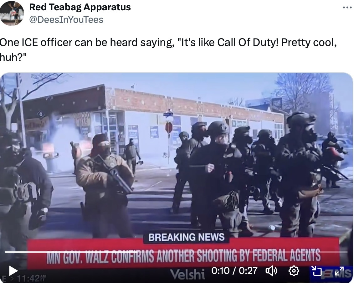 ICE agents are almost all male, and they perform aggressive, hyper-dominant masculinity. Although not part of the military, they use military-style gear, including helmets and military grade weapons. They wear camouflage and masks, are not identified by name and badge number, drive unmarked cars, and routinely use tear gas and pepper spray in their interactions with peaceful protesters, observers and bystanders. They speak in intimidating tones and escalate to violence and threats quickly. Unfit and undisciplined, they evidently consider peaceful observers and protesters as legitimate shooting targets. “It’s like Call of Duty [military video game],” an agent can be heard saying on a TV reporter’s mic while shooting rubber bullets at “ordinary citizens,” barely an hour after Pretti was killed. “So cool, huh?” An agent next to him urges others to “Take your shot! Take your shot!”