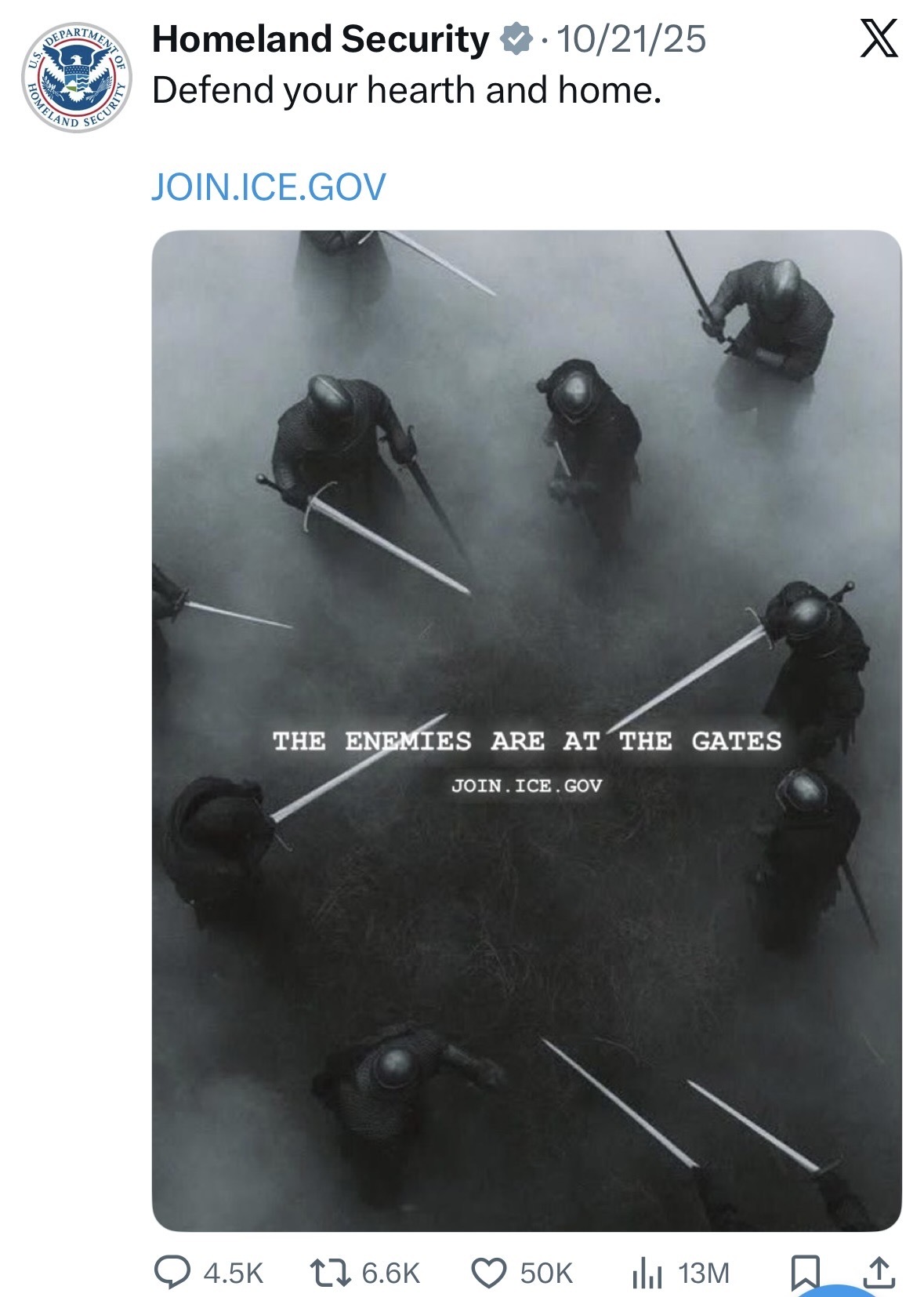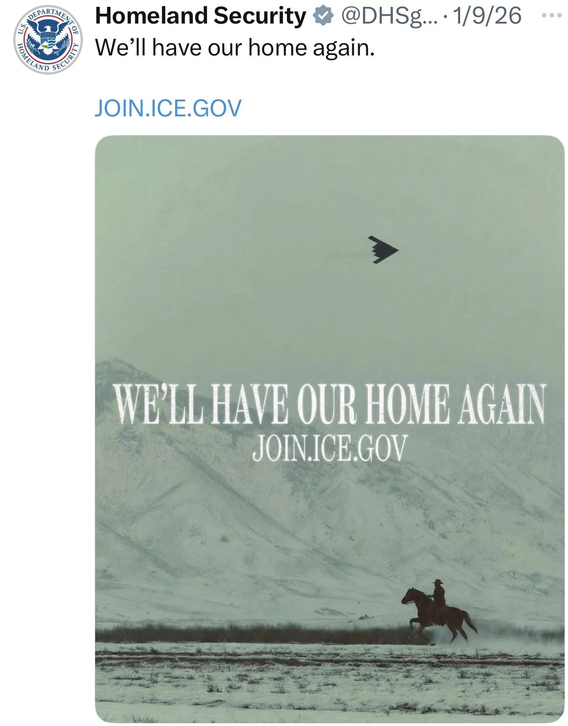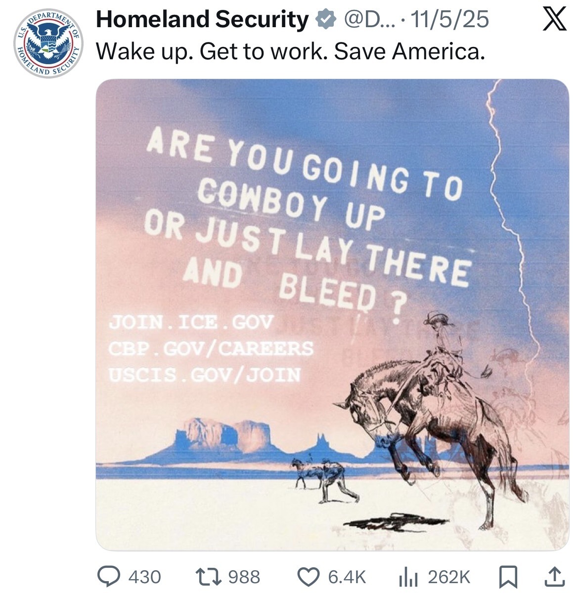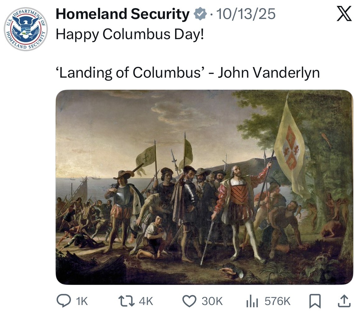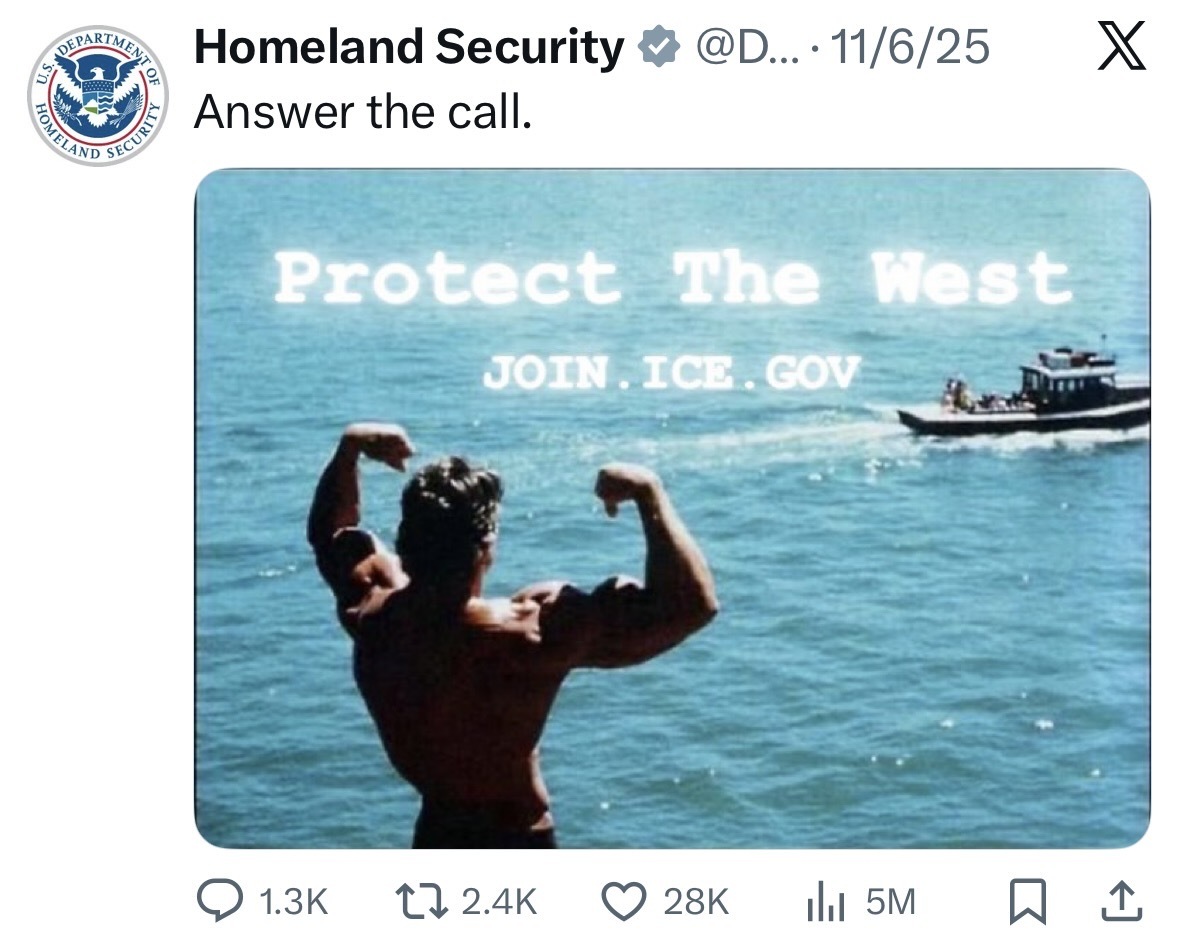 ICE and DHS recruitment posters are cartoonish in their appeal to machismo. Cowboys, muscle men, Mad Max, Star War images abound. Many posters depict U.S. soldiers in the American West during the genocide of Indigenous peoples, while a post glorifies Christopher Columbus arriving in the Americas.