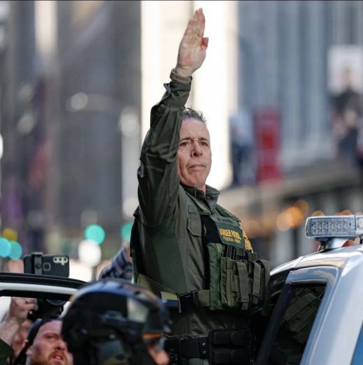 Nazi imagery is also common. Bovino, who is a little man (said to be 1m 62 or 5 feet 4 inches), wears the kind of long coat and cross-body leather strap prized by Nazi officers, with tear gas canisters dangling from his flak jacket. He also has a tendency to Sieg Heil.