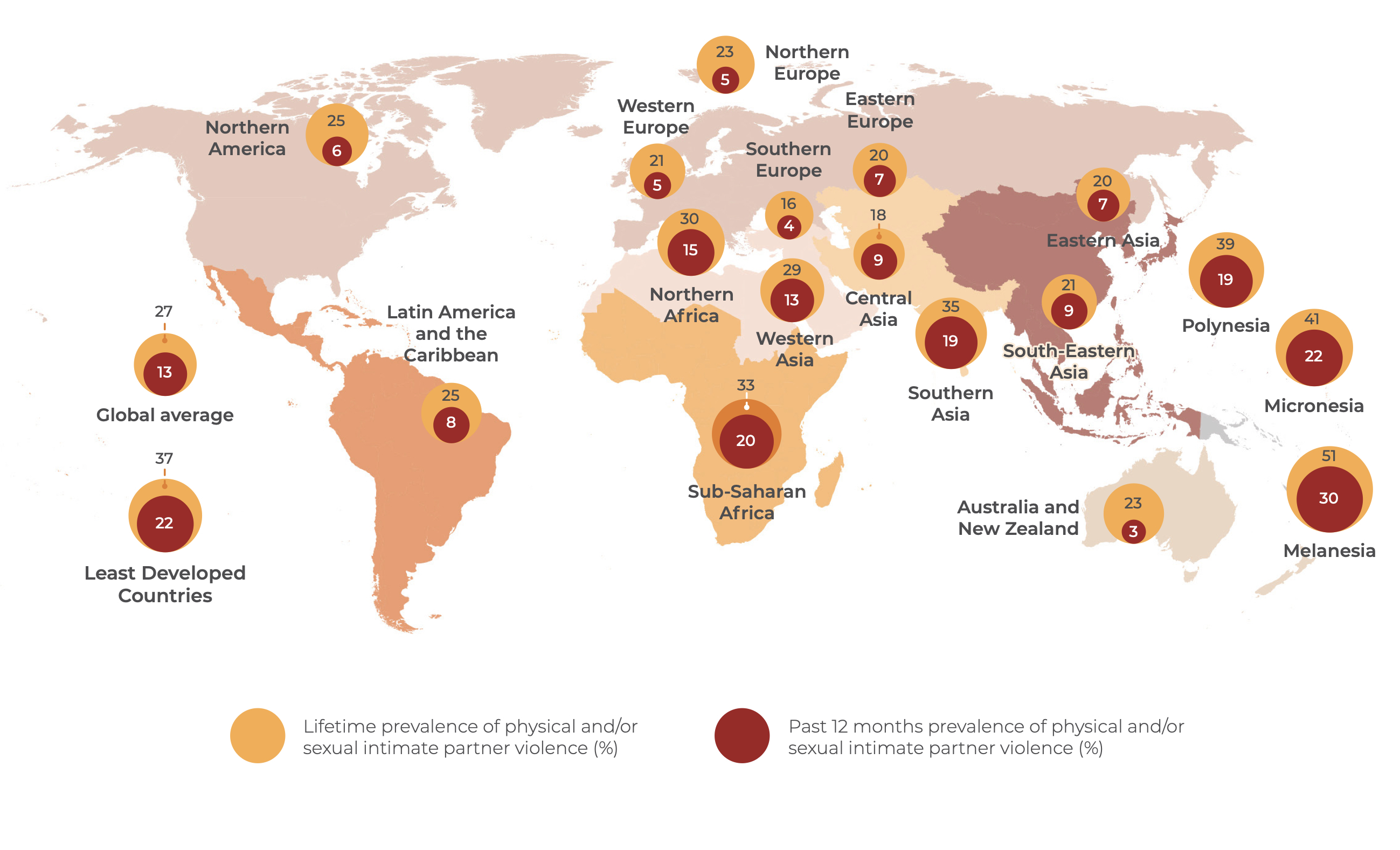 Another significant (but hopeful) finding is that prevalence of intimate partner violence against women varies a lot depending on the context and individuals’ own economic, social and cultural situation. For example, in Fiji and Papua New Guinea, the lifetime prevalence for women aged 15-49 is, respectively, a whopping 52 and 51 percent, while in Cuba and the Philippines, it is 14 percent. Women living in poverty, women with disabilities, women from ethnic or racial minorities, gender non-conforming women, and women living in conflict situations are particularly vulnerable to violence.